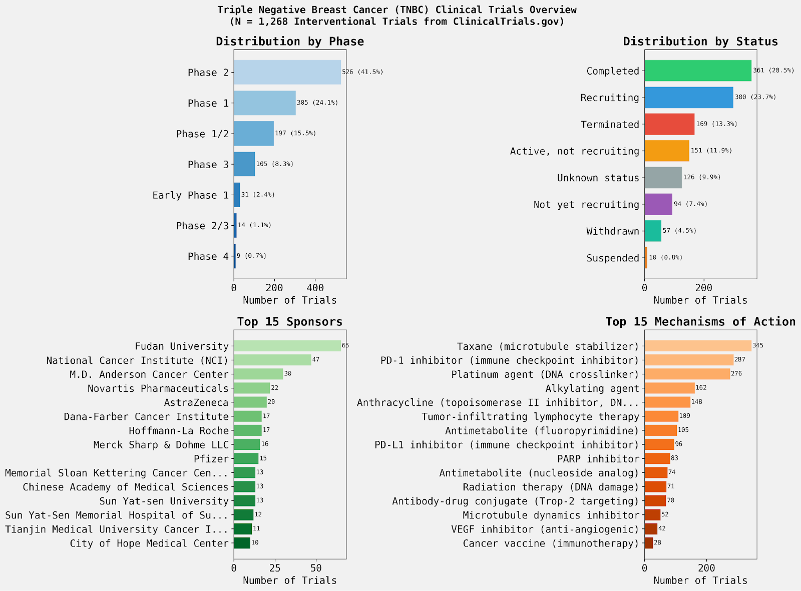 To provide an immediate high-level view, the agent also generated a multi-panel visual summary of the data. This allows researchers to identify the most active sponsors, the current clinical phase distribution, and the dominant therapeutic modalities in the triple negative breast cancer (TNBC) space at a glance.