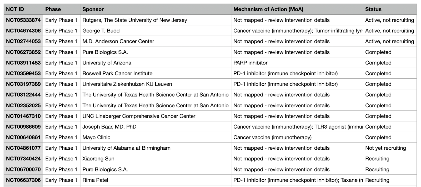 Comprehensive landscaping of clinical trials is essential to drug development and competitive intelligence, yet it remains a labor-intensive task. Identifying relevant trials, extracting their current status, and standardizing diverse mechanisms of action (MoA) across thousands of entries can be a bottleneck that typically takes days of manual work.