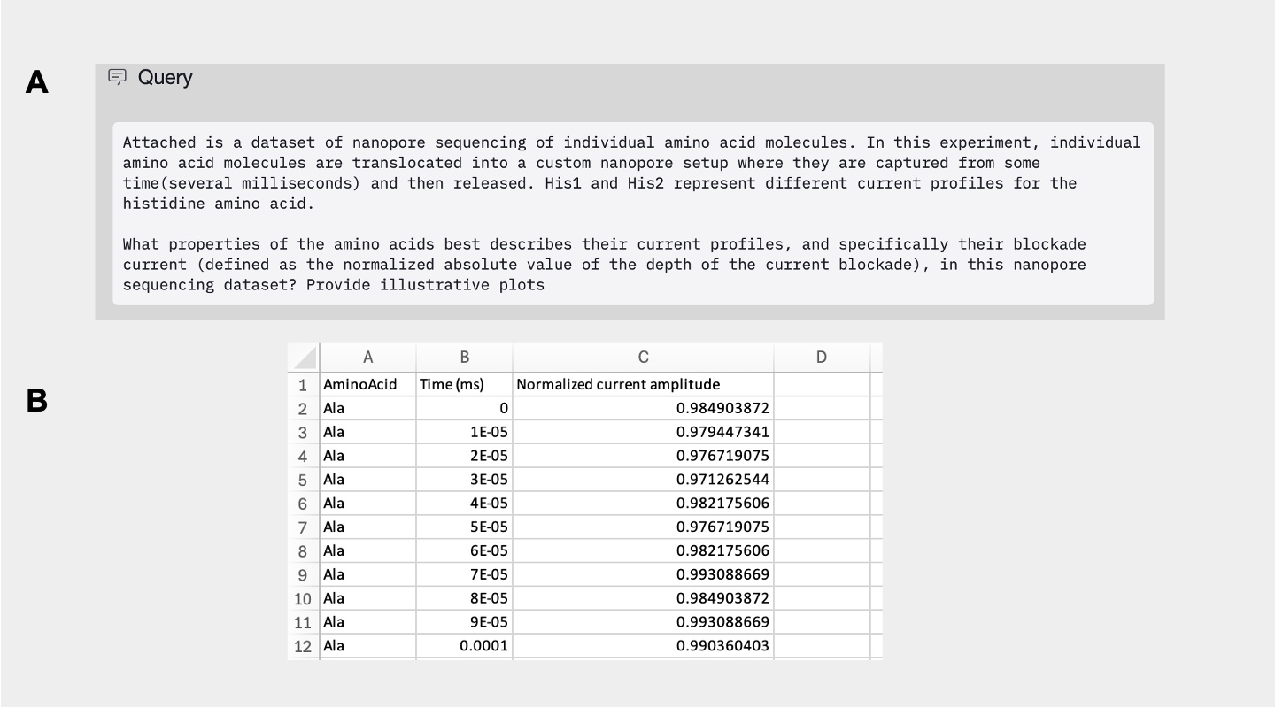 To evaluate whether Edison Analysis could interpret nanopore time-series data and to initiate the exploration of this dataset, we provided the agent with a brief prompt (Figure 1A) and a csv file of nanopore recording values for individual amino acids (Figure 1B) pulled from the supplementary materials of the manuscript.