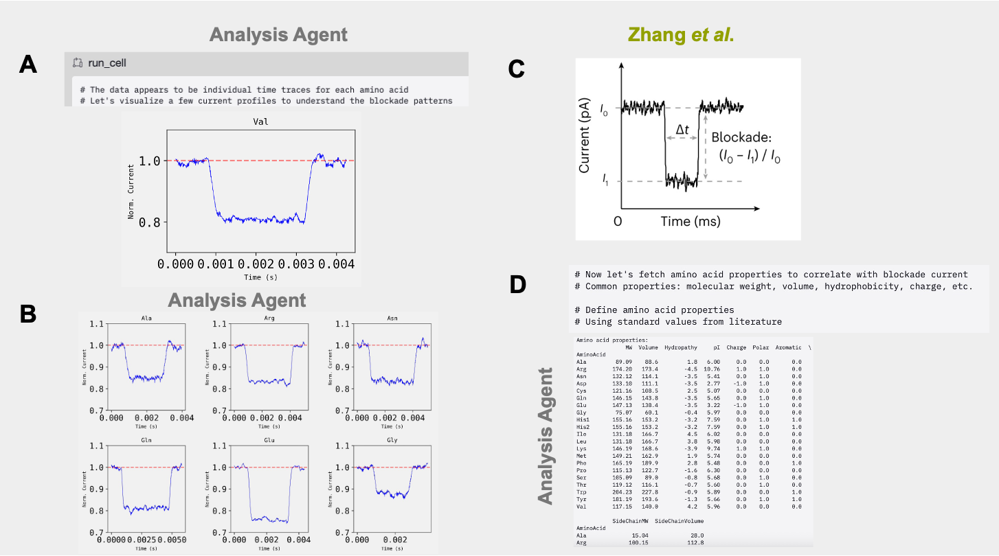 After exploring the dataset, the Analysis agent identified the open pore current (current values when no molecule is present in the nanopore) and the current blockade (current values when a molecule is present in the pore). Using these inferred baselines, the agent computed blockade amplitudes in a manner consistent with the definition provided by Zhang et al. (Figure 2A-C, Analysis Trajectory). The Agent then autonomously retrieved the canonical set of biophysical properties of amino acids (e.g. molecular weight, volume, hydrophobicity, etc.) their values from the literature (Figure 2D).
