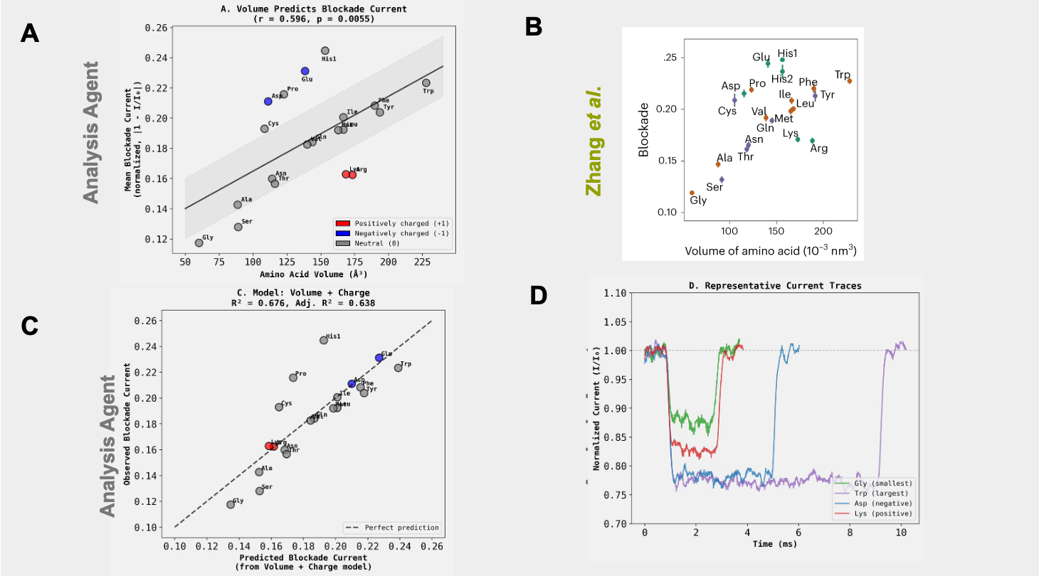 Together, these results demonstrate that the Edison Analysis Agent can autonomously interpret raw biophysical time-series data, extract meaningful quantitative features, integrate external molecular knowledge, and recover a central mechanistic insight from a state-of-the-art nanopore study. Starting from minimally structured current recordings, the agent correctly identified blockade events, computed amino acid–specific current amplitudes, and independently determined that molecular volume is the primary predictor of ionic current disruption within this nanopore configuration, recapitulating a key conclusion of Zhang et al. More broadly, this work highlights the ability of the Edison Analysis agent to move beyond standard bioinformatics workflows into the domain of single-molecule biophysics, where signal interpretation, feature extraction, and mechanistic reasoning must be tightly integrated. As experimental platforms continue to generate increasingly rich and complex biophysical datasets, autonomous systems capable of reasoning across time-series signals and molecular properties will become essential tools for accelerating discovery.
