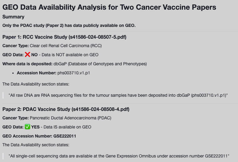 When asked in a follow-up question, the agent was then able to identify if the source data for either paper was available on GEO. The agent found that while the data from Sethna et al. was available on GEO, the data from Braun et al. was available on dbGaP.