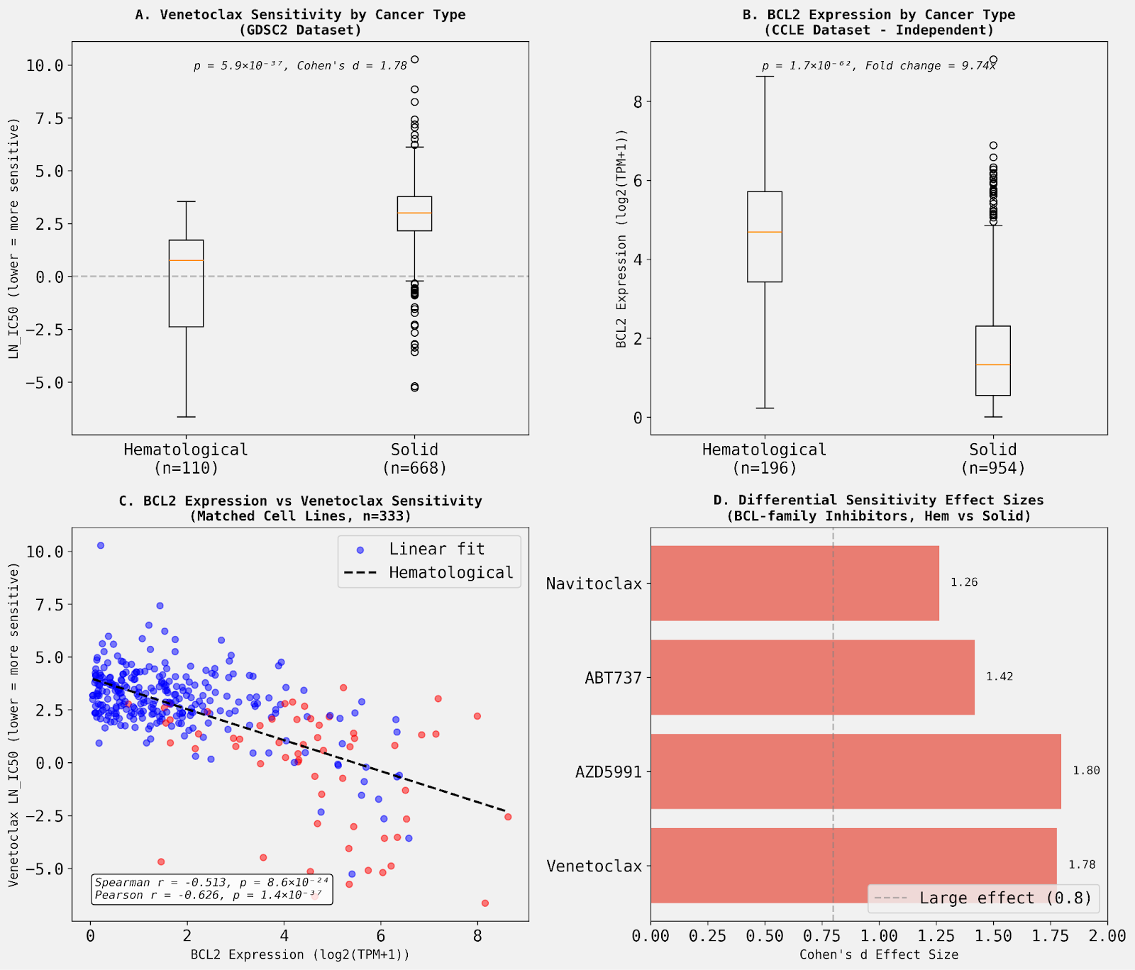 - Expression Differential: BCL2 expression was found to be 9.74x higher in hematological cancer cell lines than in solid tumors (p = 1.7×10⁻⁶²) (Figure 2B).