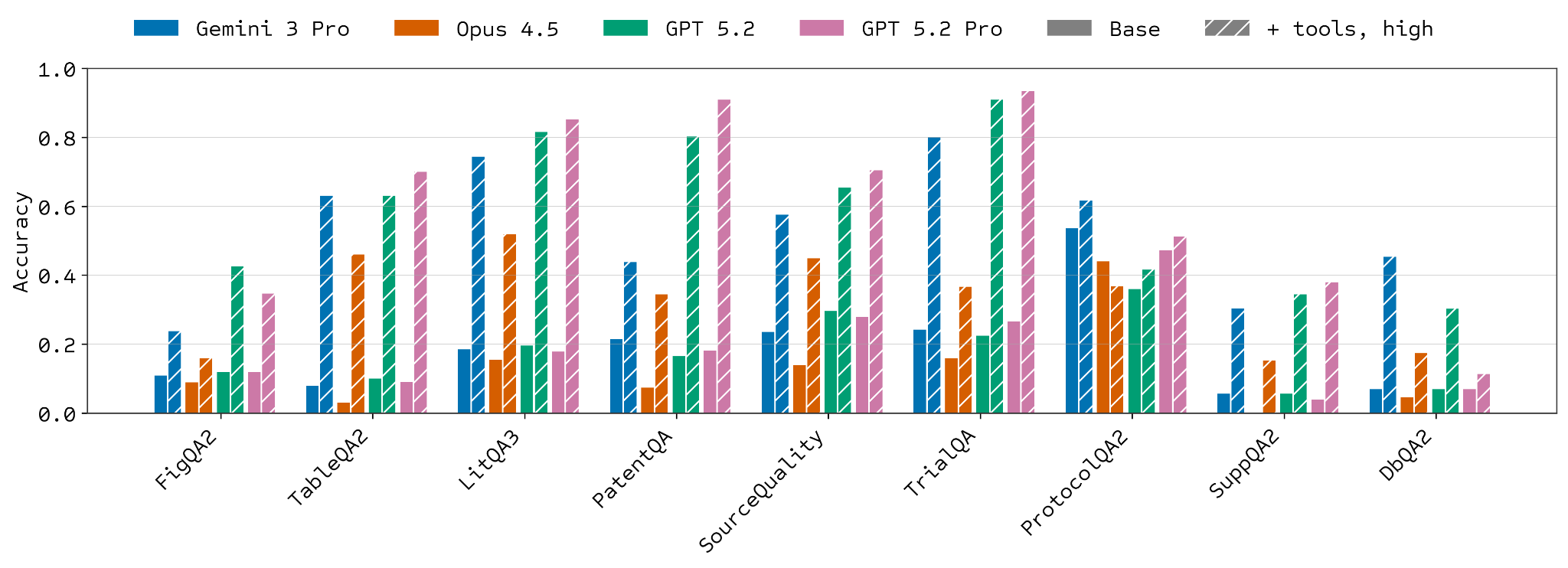 In addition to revamping the approach to the original LAB-Bench task types, we add a few important new tasks. High-value applied research relies on other sources of information, including patents and clinical trials. We thus add PatentQA and TrialQA to the suite to address these needs. Importantly, these new tasks are in part multi-modal, sometimes requiring reading a figure or table in a patent or trial. Discerning the most relevant or reliable sources for a given line of inquiry is becoming increasingly important as agents are more capable of deep research. To address this, we’ve introduced another new task category, SourceQualQA. Here, we evaluate whether models can discern why a certain research study was not included in a systematic review of a specific topic.