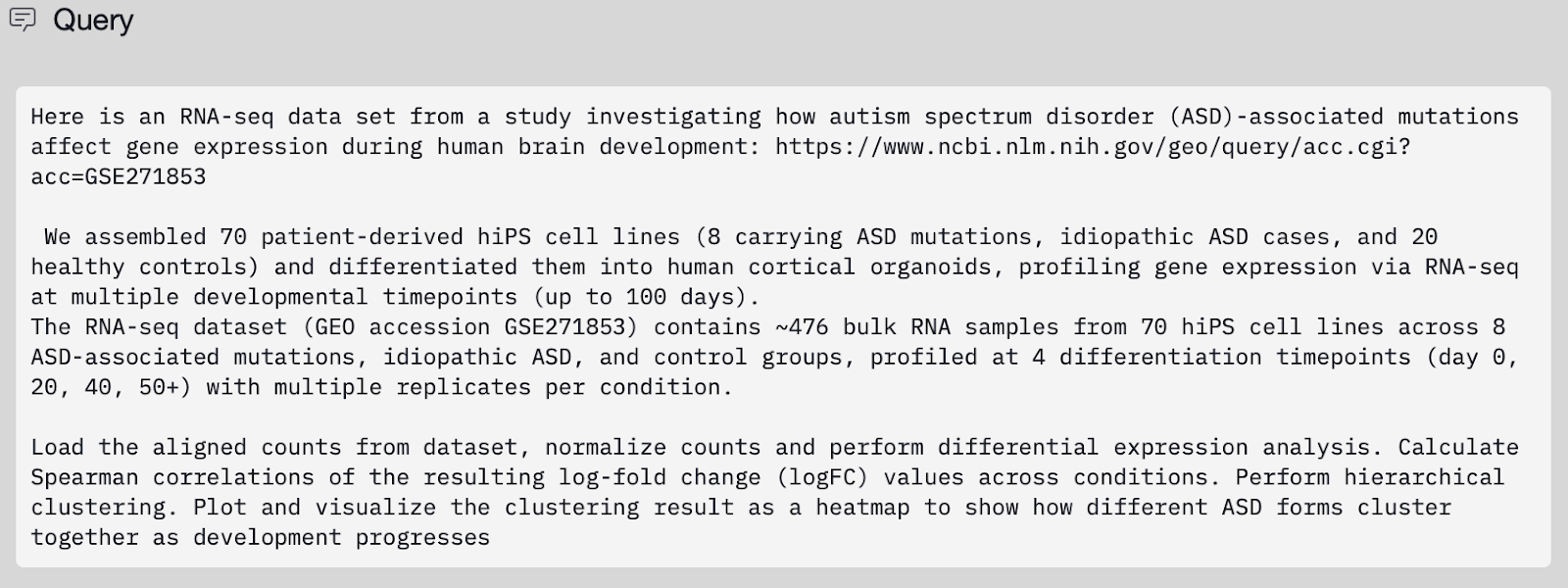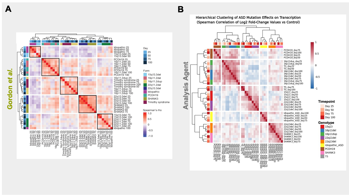 We initially sought to reproduce one of the key findings of the Gordon et al. work (Figure 2A in their manuscript) that ASD forms show gene expression similarities based on their genotypes. We first provided the Edison Analysis Agent with a prompt (Figure 1) as well as a link to the GEO dataset repository created by the authors. The Edison Analysis Agent pulled bulk RNA-seq count data from GEO, spanning 464 samples from 70 patient-derived hiPSC lines differentiated into cortical organoids across four developmental stages (days 25, 50, 75, and 100) and covering nine ASD-associated genotypes alongside healthy controls. Starting from the full 17,963-gene count matrix, the Agent normalized expression using DESeq2’s median-of-ratios method and performed differential expression at each time point by comparing each genotype to controls (Analysis Trajectory). It then treated each genotype–timepoint comparison as a condition and computed a Spearman correlation matrix over log2 fold-change profiles across all 36 conditions, followed by complete-linkage hierarchical clustering using correlation distance (1 − ρ).