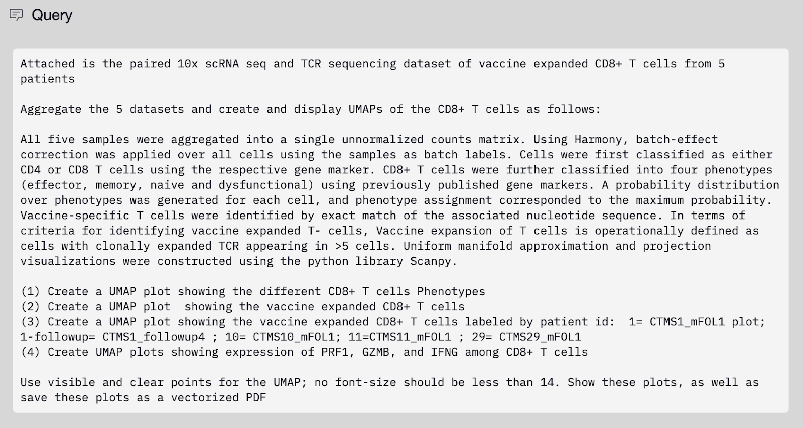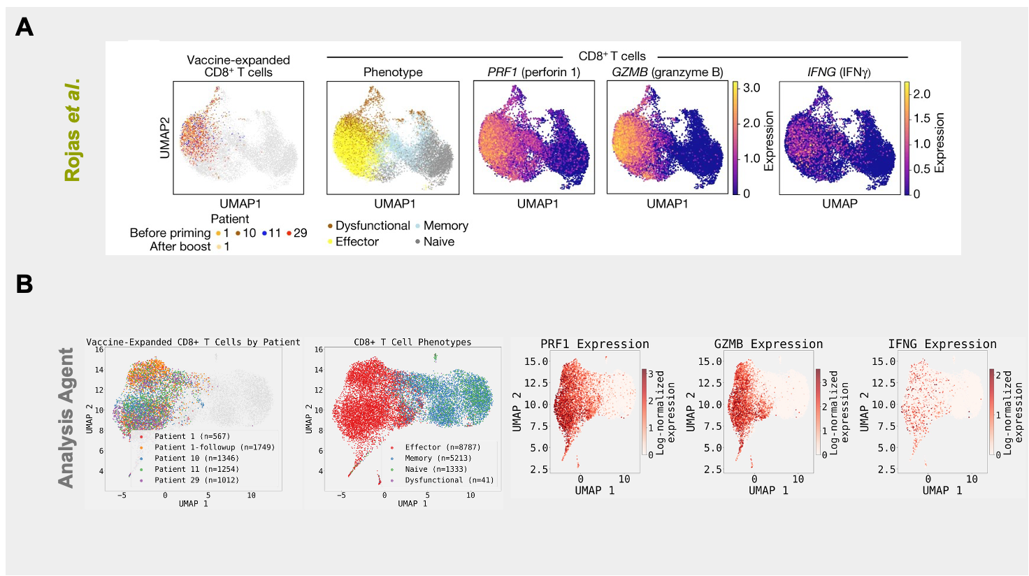 The Edison Analysis agent was able to recapitulate the main findings the authors derived from this dataset. In their work, the authors demonstrate that vaccine-expanded T-cell clones adopt a cytotoxic effector CD8⁺ T-cell state (Figure 2A). Even more, these cytotoxic T-cells express lytic agents, like perforin 1 and granzyme B, meaning that these cells are activated to attack their targets. Similar to the paper, the analysis carried out by the agent shows that the vast majority of the patient-derived vaccine-expanded T-cells have an effector phenotype (Figure 2B, Analysis Trajectory). In addition, these T-cells are also the ones that express the same lytic agents indicated in the paper. The accuracy of the analysis steps of the Analysis agent is apparent in the similarity of the UMAP renderings to the ones shown in the paper. For example, in both cases, effector and naive T-cells are the most transcriptionally distinct phenotypes, while memory T-cells are still distinct but overlap slightly with naive T-cells. Some areas of difference: while the authors show dysfunctional T-cells being more similar to effector T-cells, the UMAP visualization by the Analysis agent shows them being more transcriptionally similar to naive and memory T-cells. In addition, a slightly higher fraction of CD8+ T-cells are identified as expanded by the Analysis agent. These differences likely arise from differences in analysis steps between the authors and the Edison Analysis agent.