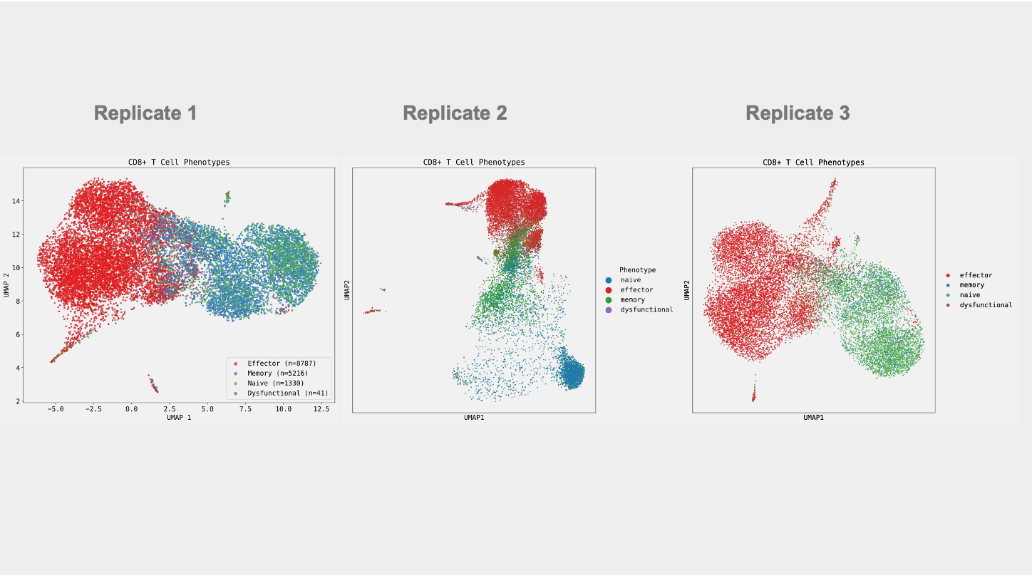 A key requirement of an autonomous AI Scientific Agent is the ability to yield consistent results when provided the same inputs. To assess consistency, we ran the agent three times providing it the same prompt and dataset as above. Each time, the Analysis agent produced results that retained the same essential biological conclusions (Figure 3, Trajectory 1, Trajectory 2, Trajectory 3). For instance, in each case over 90% of vaccine expanded CD8+ T-cells are classified as having effector phenotypes (91.6%, 96%, 97.6%). In all cases, effector and naive T-cells are the most dissimilar in terms of expression profiles while memory T-cells lie somewhere in between. In addition, the agent used the same criteria for classifying CD8+ T-cells by using the combined expression of CD8A and CD8B and comparing it to the CD4 expression. Yet, there are differences in processing that introduce variability in the final result. Given that the Analysis agent was provided discretion to come up with criteria for classifying CD8+ T-cells, it used slightly differing combinations of marker genes for assigning phenotypes in each run. In addition, the number of highly-variable genes used for the PCA, batch-correction, and UMAP rendering steps are also slightly different. If desired, further consistency can be achieved by providing more narrow instructions to the agent.